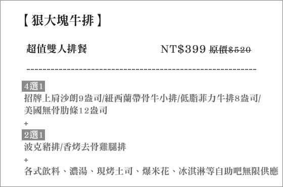 ![]() SPARKLE Hotel 思泊客.B CAPE 牛排館-美國肋眼超值雙人套餐 熟成牛排歷時發酵,孕育如同醇酒般的野性風味,講究味覺頂尖質感,教父級手藝經典傳承 售價:2880 我要購買 SPARKLE Hotel 思泊客.B CAPE 牛排館-美國肋眼超值雙人套餐-熟成牛排歷時發酵,孕育如同醇酒般的野性風味,講究味覺頂尖質感,教父級手藝經典傳承SPARKLE Hotel 思泊客.B | ![]() 嵐町目日式拉麵-套餐方案 售價:299 我要購買 嵐町目日式拉麵-套餐方案-天冷就來嵐町目吃拉麵!以新鮮食材烹調出每一道美味佳餚,拉麵湯頭濃香醇,入喉就是點滴溫暖浸心頭!只要299元起即可享用【嵐町目日式拉麵】原價最高1175元套餐方案:(A)雙人日 | ![]() 快樂大廚-嚴選去骨雞腿排 售價:68 我要購買 快樂大廚-嚴選去骨雞腿排-現買現賺的高級去骨雞腿排,大份量超夠本,還有七種口味自由選!輕鬆煎熟就能大口享用餐廳級美味料理!只要68元即可購得【快樂大廚】原價200元嚴選去骨雞腿排1包(230g/包), |