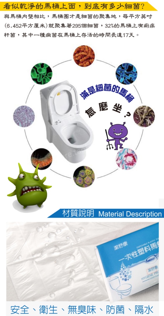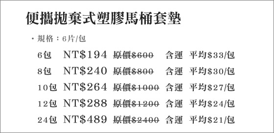 | 便攜拋棄式塑膠馬桶套墊-外出W.C.衛生救星!一次性塑料馬桶套,攜帶方便、使用簡單、杜絕細菌,各場所適用,到哪方便都安心!只要194元起(含運)即可購得原價最高2400元便攜拋棄式塑膠馬桶套墊6包/8 售價:21