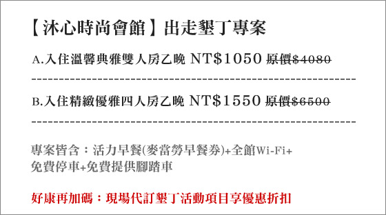 KATE是我的好朋友,為人正直又有愛心;KATE他只會推荐好東西!沐心時尚會館-出走墾丁專案該商品熱烈銷售中~ 避免向隅,欲購從速~包含更進一步圖文資訊的介紹!點擊圖片或文字可以進到更詳細購物推薦網站~KATE最近也對這個商品很感興趣,因為我自己也想要了解沐心時尚會館-出走墾丁專案,所以到處尋找資訊做功課. |  | 沐心時尚會館-出走墾丁專案-位於恆春市中心鄰近古城、老街,鐵馬優遊巷弄訪恆春風情,出走墾丁度過悠閒假期,戀上半島淳樸之風只要1050元起即可享有【沐心時尚會館】原價最高6500元出走墾丁專案:(A)入 售價:1050