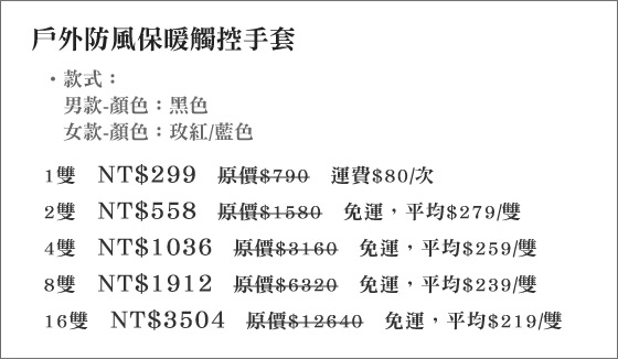 最近我也在找戶外防風保暖觸控手套的相關資訊~一直以來我都很相信LIZ推荐的東西。LIZ也嘗試積極推荐,並介紹我該商品優缺點。最近有些網友在問戶外防風保暖觸控手套要去哪裡買最便宜呢?整理資訊大致有分享文、開箱文、試用文、評鑑文、推薦文、是否便宜、優缺點等資訊. |  | 戶外防風保暖觸控手套-油門催落去!雙手冷吱吱!冬天出門戴上戶外防風保暖手套,手機觸控佳,不僅保暖更防風防水,騎車不煎熬平均每雙最低只要219元起(含運)即可購得戶外防風保暖觸控手套1雙/2雙/4雙/8 售價:219