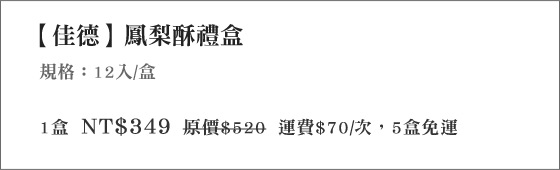 | 真的!連平常日也大排長龍! 每個台北人都知道的超人氣名店,每逢過節一盒難求! 現在直接幫您送到家,數量有限,先搶先贏! 關於【佳德】【佳德】創立於1975年,秉持一本出衷的專業與熱誠,堅守優良品質、合理價格與衛生美味的信念,精心推出鳳梨酥等相關產品。 台北最佳伴手禮,冠軍鳳梨酥! 點我去看影片報導  榮獲台北市第一屆鳳梨酥節金賞獎 第一名、台北市第二屆鳳梨酥節創意鳳梨酥金選獎 第一名等多項殊榮,獲得官方的肯定與推薦。   每逢過節,店門口就會出現長長的排隊人龍,每個台北人都知道的超級名店,過年伴手禮的最好選擇,平均最低一盒只要399元,省荷包又有面子! 原味鳳梨酥禮盒皮薄餡多、鬆香、不黏牙,夾藏著口感細緻的美味內餡,輕輕一口就可以感受到精緻茗點! 商品說明品名:【佳德】超人氣排隊鳳梨酥禮盒規格:12入/盒 主要成分:麵粉、砂糖、進口奶油、鹽、蛋、鳳梨餡、少許冬瓜餡 保存方式/期限:常溫40天 產地:台灣 ※爲保持產品最佳風味,開封後請盡速食用完畢 | 詳細商品說明 | 當今網購市場很競爭,各大購物網為求好業績無所不用其極,殺價毫不手軟。雅虎購物、momo購物及博客來是我比較常去逛的EC網購平台,常常有優惠商品可撿便宜。網路購物EC是擋不住的趨勢,可以方便比價只要用功通常都能買到相對便宜的商品!佳德-鳳梨酥禮盒該商品熱烈銷售中~ 避免向隅,欲購從速~COLIN最近也對這個商品很感興趣, | SAMANTHA最近也對這個商品很感興趣,佳德-鳳梨酥禮盒數量有限,售完為止!限量是殘酷的,不要猶豫入手要快~我有去遍尋各大購物網站momo購物、yahoo奇摩購物、博客來、PChome線上購物、ibon mart搜尋優惠價格!SAMANTHA一向是個理性的消費者,能讓他讚賞的商品不多了!要到處比價;尋找低價及可靠的網購地方! | ※其他推薦※